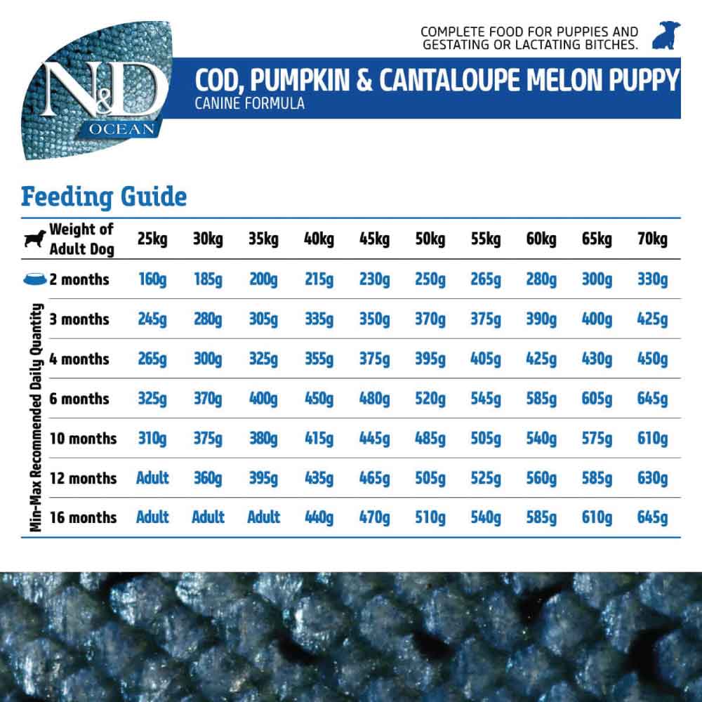 Formulated to meet the nutritional levels established by the AAFCO Dog Food Nutrient Profiles for All Life Stages including growth of large size dogs (70 lb. or more as an adult). N&D Ocean, both dry and wet food, are complete diets containing ALL the necessary nutrients for the daily well-being of our four-legged family members, brings the benefits of seafood in your pet food. The main ingredient, Codfish is high in protein and low in fat, which makes it an excellent protein source. Cod is also high in vitamins and minerals, and a source of Omega-3 fatty acid which contribute to the functioning of the cardiovascular, endocrine, and immune systems. Pumpkin is a typical vegetable of the Italian food tradition that has unique nutritional and many beneficial properties like Anti-diabetic, Supports immune system, Active against free radicals resulting also in an anti-carcinogenic effect, Promotes cardiovascular system protection, Regulates intestinal motility, Anti-inflammatory effect, Soluble fiber and antioxidants. Cantaloupe melon is a super food which contain antioxidants for inflammation, Dietary fiber for proper digestion, low calorie and optimum quantity of minerals.