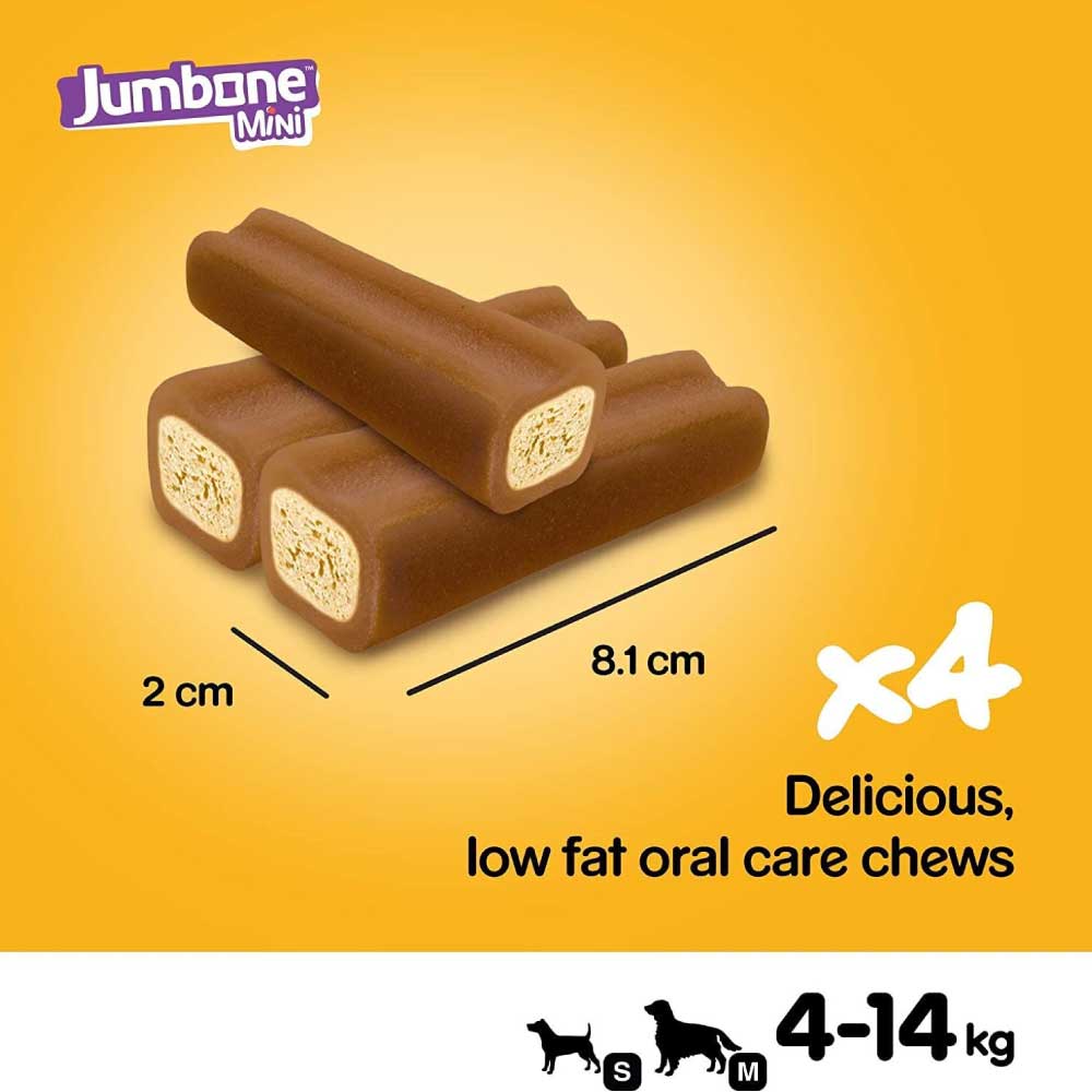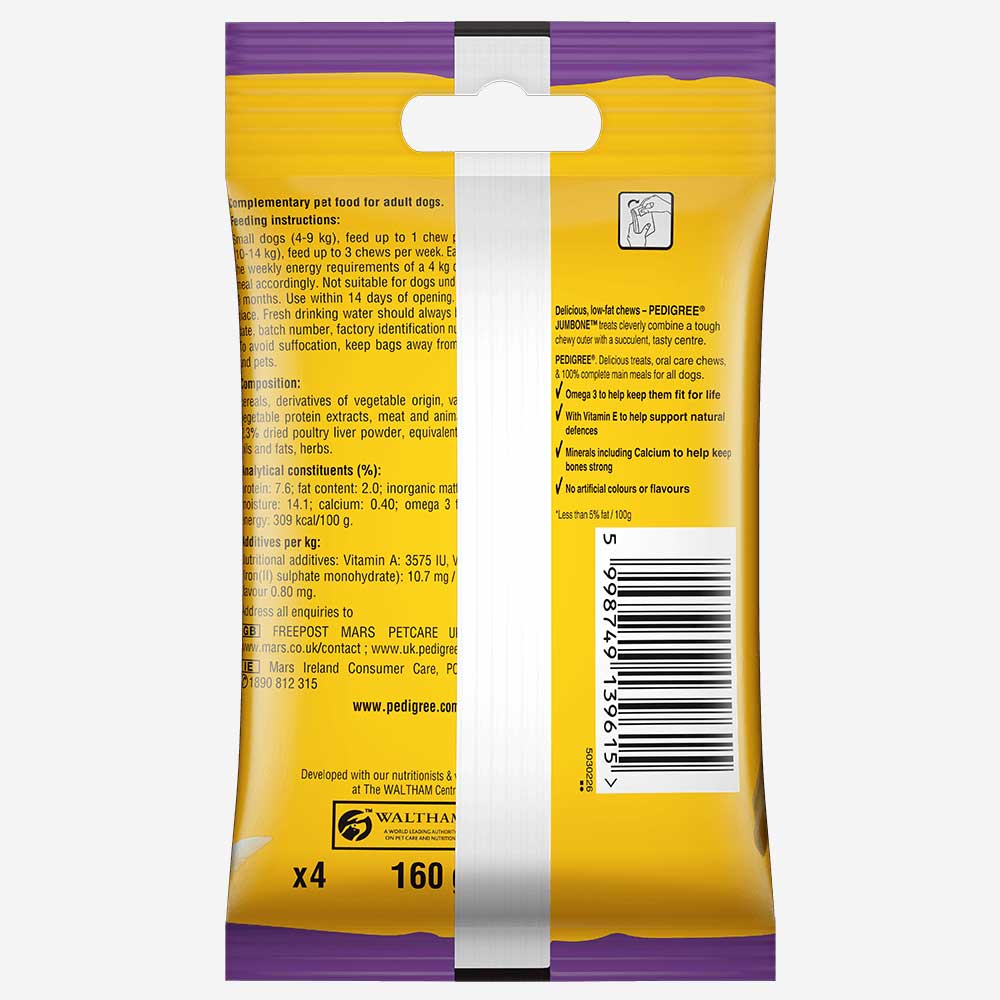 With no artificial colours or flavours, Pedigree recommends feeding 1 Jumbone dog chew per week to small dogs (4-9 kg), feed up to 3 chews to 10-14 kg dog.