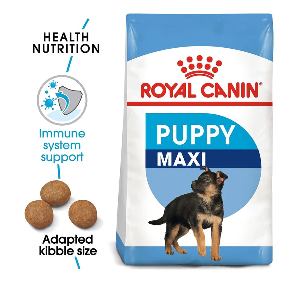 ROYAL CANIN Maxi Puppy is specially formulated with the nutritional needs of your large puppy in mind. This food is suitable for large puppies from 2 to 15 months old that will have an adult weight of approximately 26kg-44kg. ROYAL CANIN Maxi Puppy food contains a patented complex of antioxidants – including the highly beneficial vitamin E – to support your puppy’s natural defences while its immune system is immature and still developing. The combination of nutrients that contain high quality protein (such as L.I.P., known for its very high digestibility) as well as prebiotics like FOS help to support your puppy’s digestive health Large puppies have a long growth period, that’s why they need a diet that accounts for the implications of this period. Fortunately, ROYAL CANIN Maxi Puppy contains a moderate energy level to meet your puppy’s energy needs. A variation of ROYAL CANIN Maxi Puppy dry food is also available depending on your puppy’s lifestyle. If your large puppy is quite active then it will have higher energy needs, if this is the case then why not try ROYAL CANIN Maxi Puppy Active.