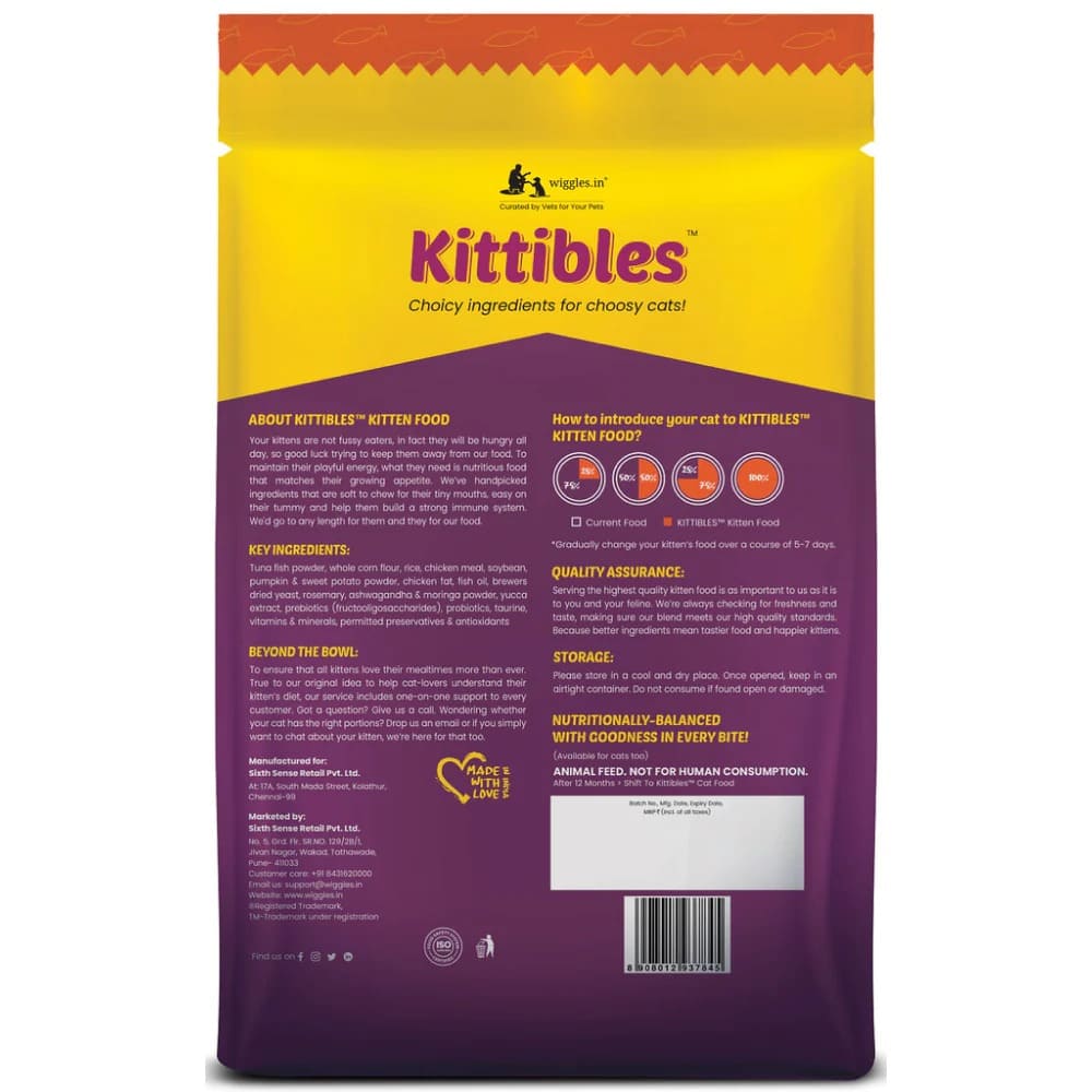 Wiggles Kittibles Chicken and Tuna Kitten Dry Food is made with immunity-boosting herbs like rosemary, ashwagandha and moringa that make your kitten stronger from the get-go. Rich in Vitamin E and essential taurine, Kittibles™ ensures that your kitten grows up to be strong with a healthy heart Combination of tuna fish powder, chicken meal, soybean, pumpkin, sweet potato and fish oil leaves your kitten feeling full and happy. Kittibles is a one-of-a-kind kitten food that is infused with prebiotics and probiotics to keep your young kitty’s gut health in check Perfect for kittens under 1 year of age as the kibbles are small and soft to chew, ideal for their tiny mouth and loud meows! Made with 100% human-grade ingredients and real meats only.